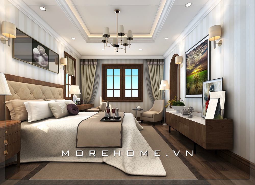 Thiết kế giường ngủ Master tân cổ điển sang trọng, màu sắc nhẹ nhàng tinh tế không quá cầu kỳ tạo cảm giác thư thái và nhẹ nhàng trong mỗi giấc ngủ