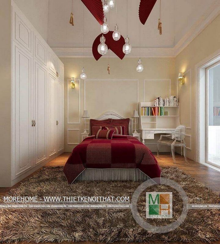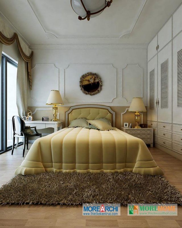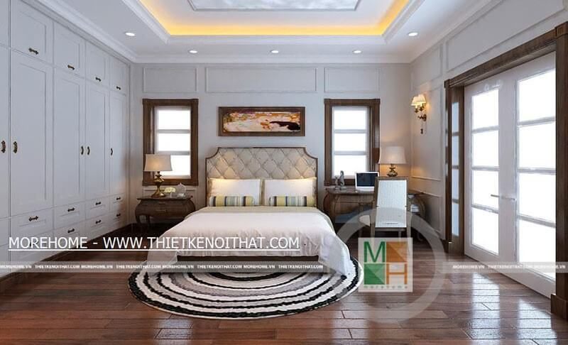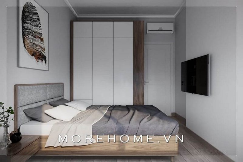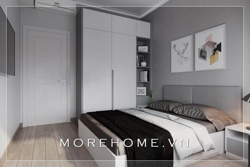 Tủ quần áo gỗ màu trắng, được thiết kế âm tường giúp căn phòng thoáng, rộng hơn