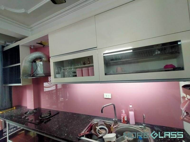 Mẫu kính ốp bếp màu hồng lãng mạn, một trong những tông màu có khả năng khơi gợi cảm xúc thư giãn, thoải mái, phù hợp không gian phòng bếp phong cách hiện đại