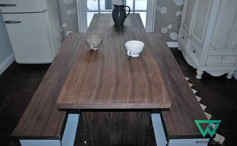 Nếu như bạn thường bắt gặp ghế băng ở lớp học thì có lẽ bạn chưa biết rằng có một mẫu bàn ghế ăn làm từ gỗ óc chó đẹp cũng có thiết kế ghế băng. Ghế băng tiện lợi ở chỗ bạn không cần sắp xếp quá nhiều những chiếc ghế đơn, không vướng víu khi có người đứng lên ngồi xuống trong bữa ăn. Không chỉ vậy ghế băng gỗ óc chó còn giúp tận dụng được diện tích ngồi rất đáng kể. Hai chiếc ghế băng hai bên cùng chiếc bàn ăn ở giữa chỉ đơn giản là 3 tấm gỗ nhẵn nhụi, thẳng thớm mà lại mang đến sự độc đáo mà không phải căn phòng ăn nào cũng có được.